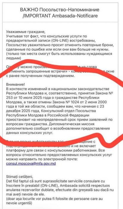 Ambasada Republicii Moldova în Federația Rusă a anunțat suspendarea, pe termen nelimitat, a procesului de primire a cererilor pentru obținerea cetățeniei moldovenești, ca urmare a aplicării noii Legi a cetățeniei.