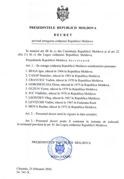 Lista persoanelor vizate este inclusă în decretul prezidențial publicat oficial. Retragerea cetățeniei reprezintă una dintre cele mai severe măsuri aplicate în astfel de cazuri și reflectă poziția fermă a autorităților față de acțiunile care subminează integritatea teritorială a Republicii Moldova.